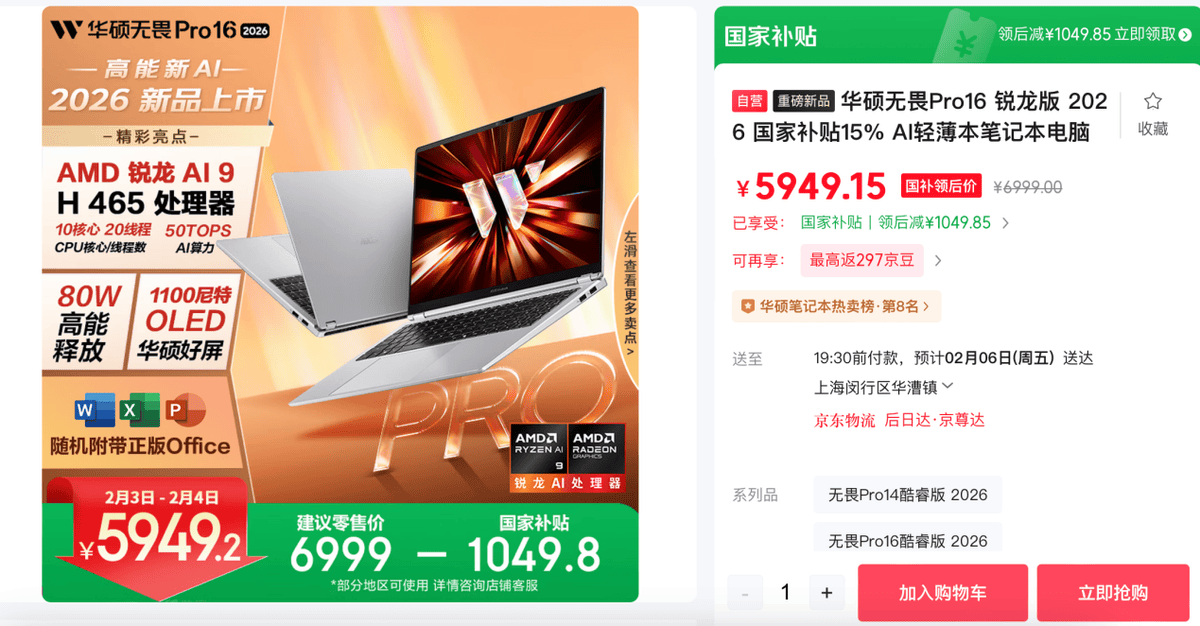 对于万能类型的办公本,别的无畏Pro14 2026锐龙版也已发售,#京东沉磅新品日# 1月28日华硕京东沉磅新品日# 东搜刮“华硕无畏Pro 2026”即可领会更多详情。如许的续航表示脚以撑满全天。别的,100% DCI-P3广色域、sRGB/DCI-P3/Display P3/原生等四种专业色域切换,长续航是新一代锐龙AI本的焦点劣势之一,华硕无畏Pro16 2026锐龙版已正在京东等电商平台开售,因而无论是保守的文字、视频办公,一直连结高度分歧性的色彩呈现。